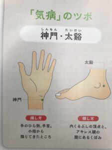 ★気病のツボ❗️                    神門(しんもん).太谿(たいけい)神門は手のひら側、手首、小指から降りてきたところ    太谿は足内くるぶしの頂点とアキレス腱の間にあるくぼみ。   ★気病は是動病(ぜどうびょう) 気虚と気滞による体調不良は、気の病なので「気病」です。 ★鍼灸治療の古典「難経」には気の病は是動病、血の病は所生病(しょうせいびょう)とあります。ここでは気が先に停滞して是動病となり、それが慢性化すると所生病になると書かれています。検査で異常なしだけれども調子が悪い、痛いところがあちこち変化するなどは是動病です。            ♡ 気の病は血の病になる手前です。血の病が病気なら気の病は”未病を治す”の未病です。 つかみどころのない「気の病」こそ、治療と養生のヒントが隠されています。       ♪気は腎陽気の事です。腎と心が強力することで生成されます鹿茸、冬虫夏草は腎陽気を補う補陽薬です。補陽薬は腎と心のバランスを整えてくれます。 鍼灸師 宮地つかさ著